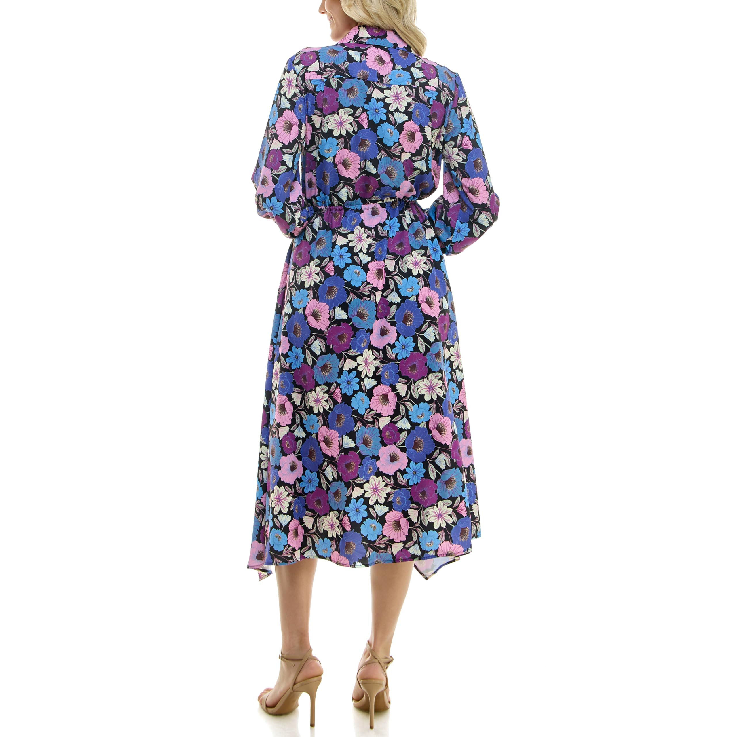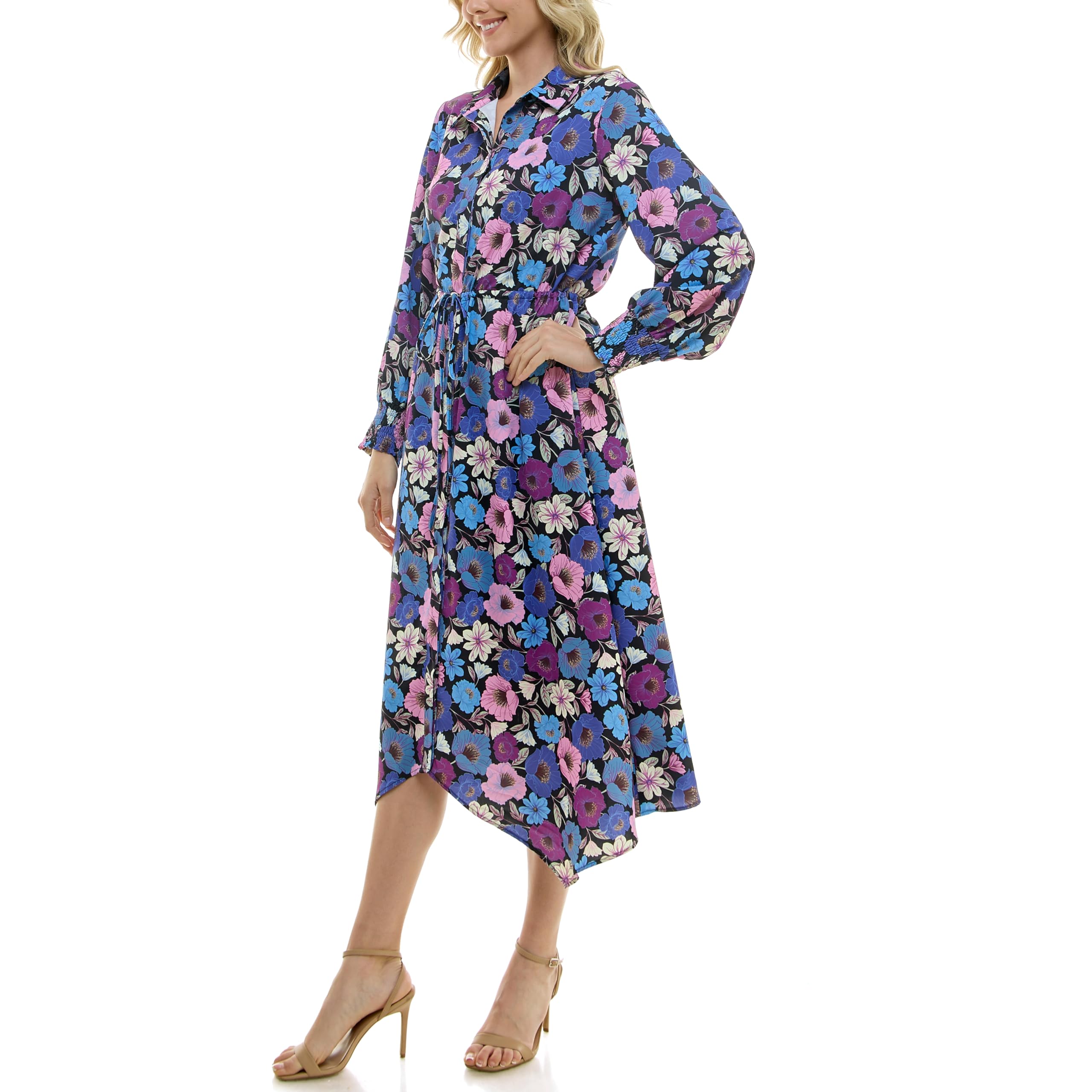 Description:This floral midi dress features a vibrant mix of blue, purple, pink, and black tones for a bold yet feminine look. The allover floral print gives it a lively, romantic feel, while the button-front bodice adds a polished shirt-dress touch. Designed with long sleeves, a softly defined waist, and an asymmetrical hem, this dress creates a flattering silhouette with graceful movement. It is...