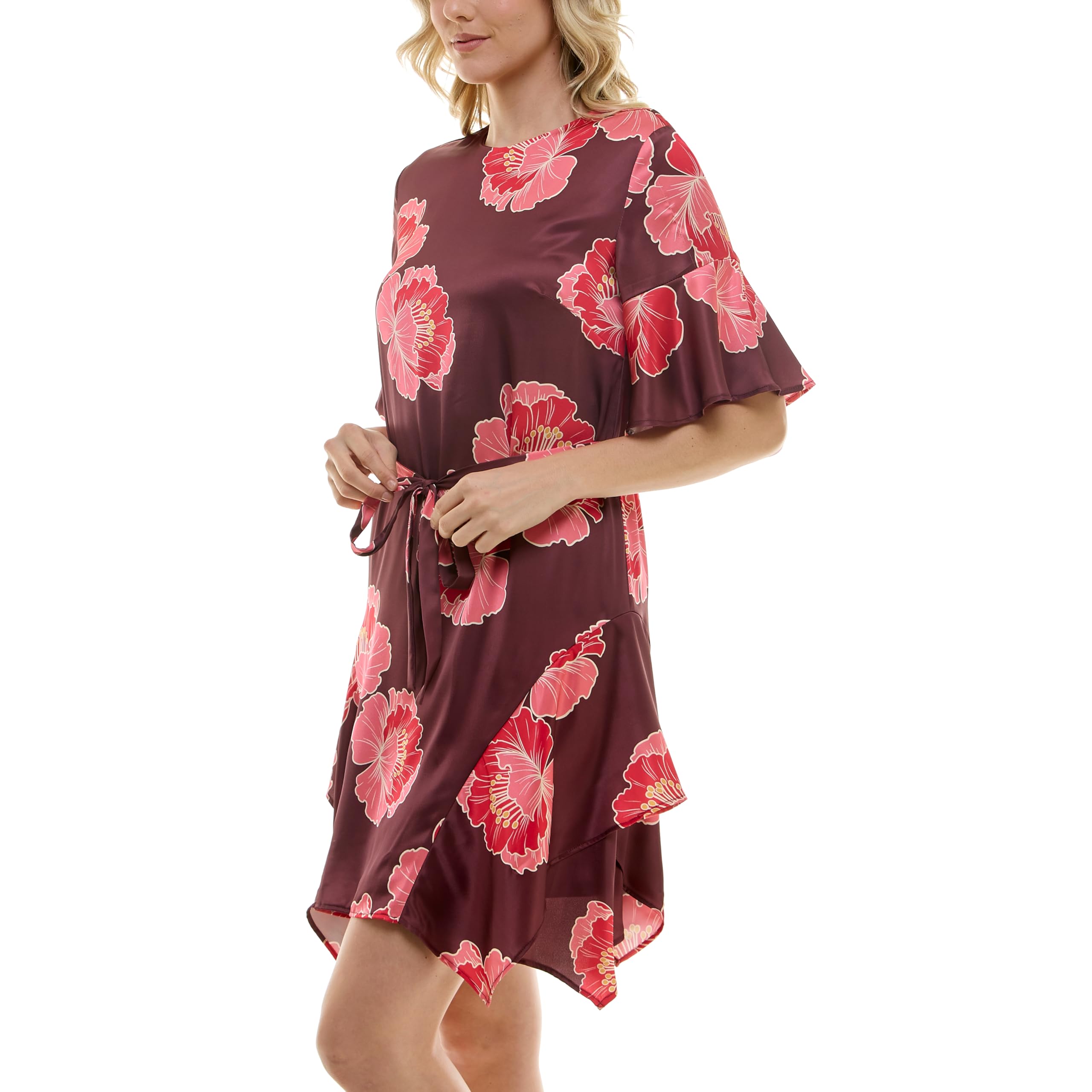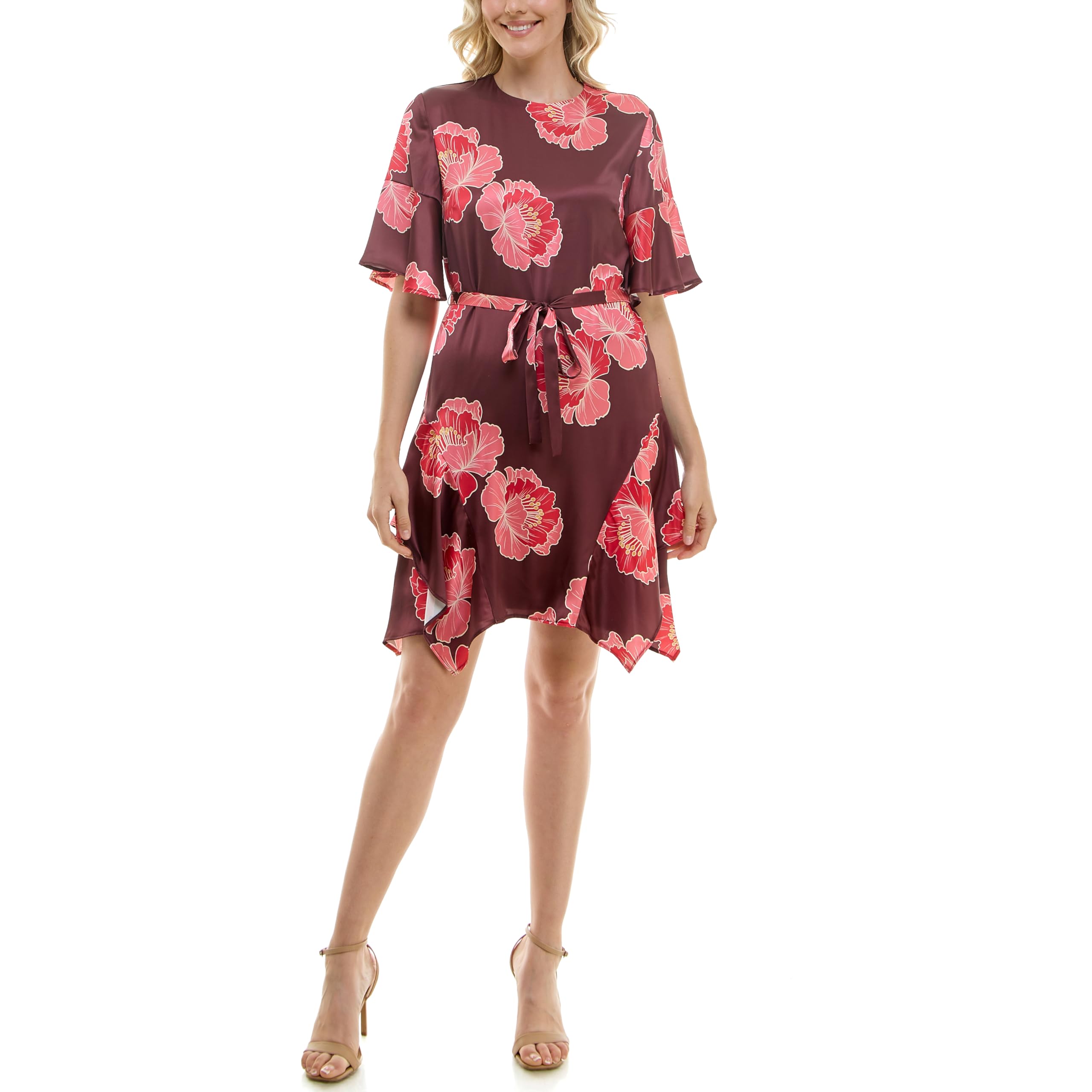 Description:This floral dress features a rich burgundy base with oversized red and pink flower print for a romantic and eye-catching look. The round neckline and flutter sleeves create a soft, feminine feel, while the self-tie waist helps define the silhouette in a flattering way. Finished with an asymmetrical handkerchief hem, this dress moves beautifully and adds a light, flowy touch. It is a lo...