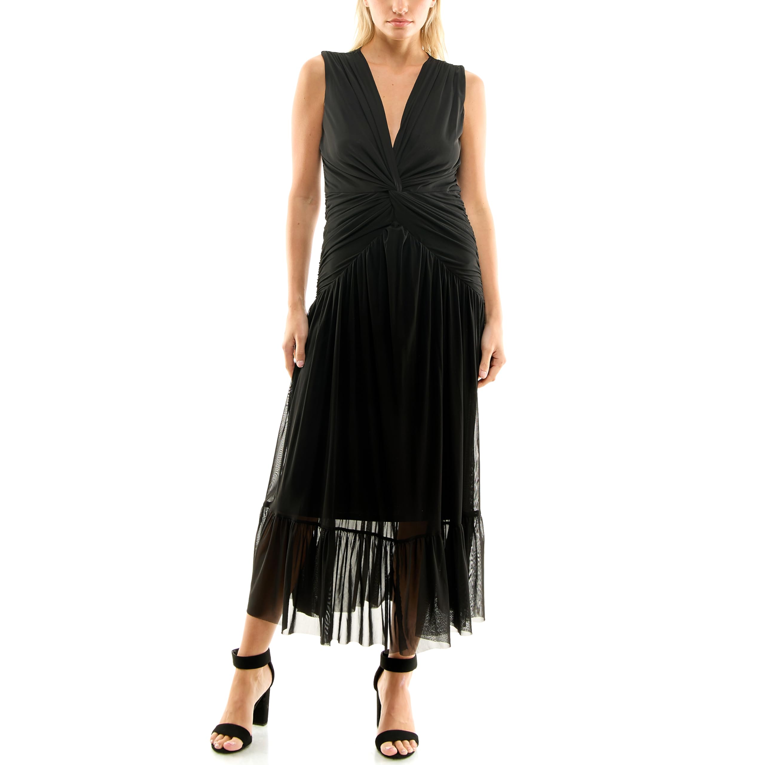 \nDescription:This elegant black dress features a sleek sleeveless silhouette with a flattering V-neckline and a twist-front bodice that adds soft texture and shape. The gathered waist detail enhances the figure, while the flowing skirt brings graceful movement to the overall look. Finished with a sheer layered hem, this dress feels refined, feminine, and slightly dramatic, maki...