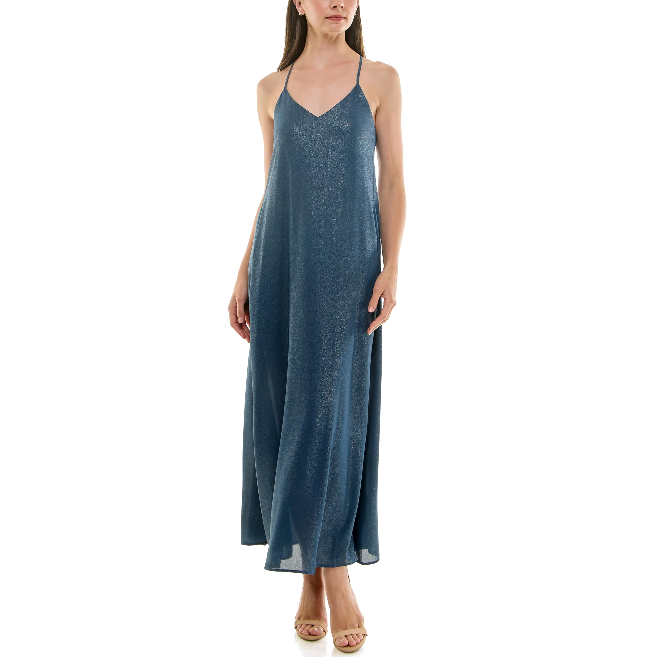 Description:This elegant maxi dress features a soft dusty blue tone with a subtle shimmer finish for a refined and graceful look. The V-neckline and slim spaghetti straps create a light, feminine silhouette, while the relaxed flowy shape adds effortless movement. Designed with a full-length skirt and airy drape, this dress is a beautiful choice for parties, vacations, summer events, beach weddings...